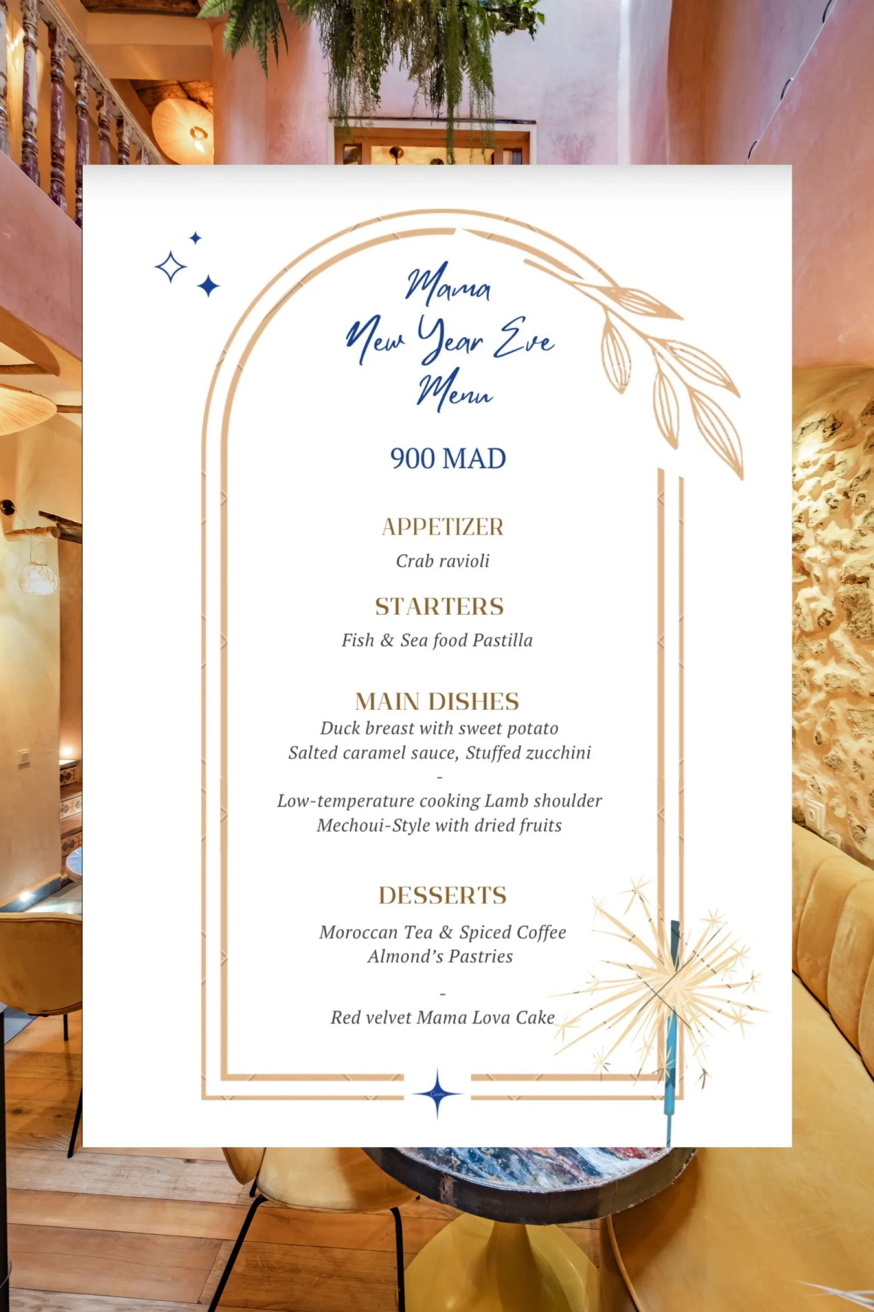 This refined New Year’s Eve menu blends Mediterranean elegance, French gastronomy, and Moroccan flavors, offering a warm and festive journey through carefully curated dishes.